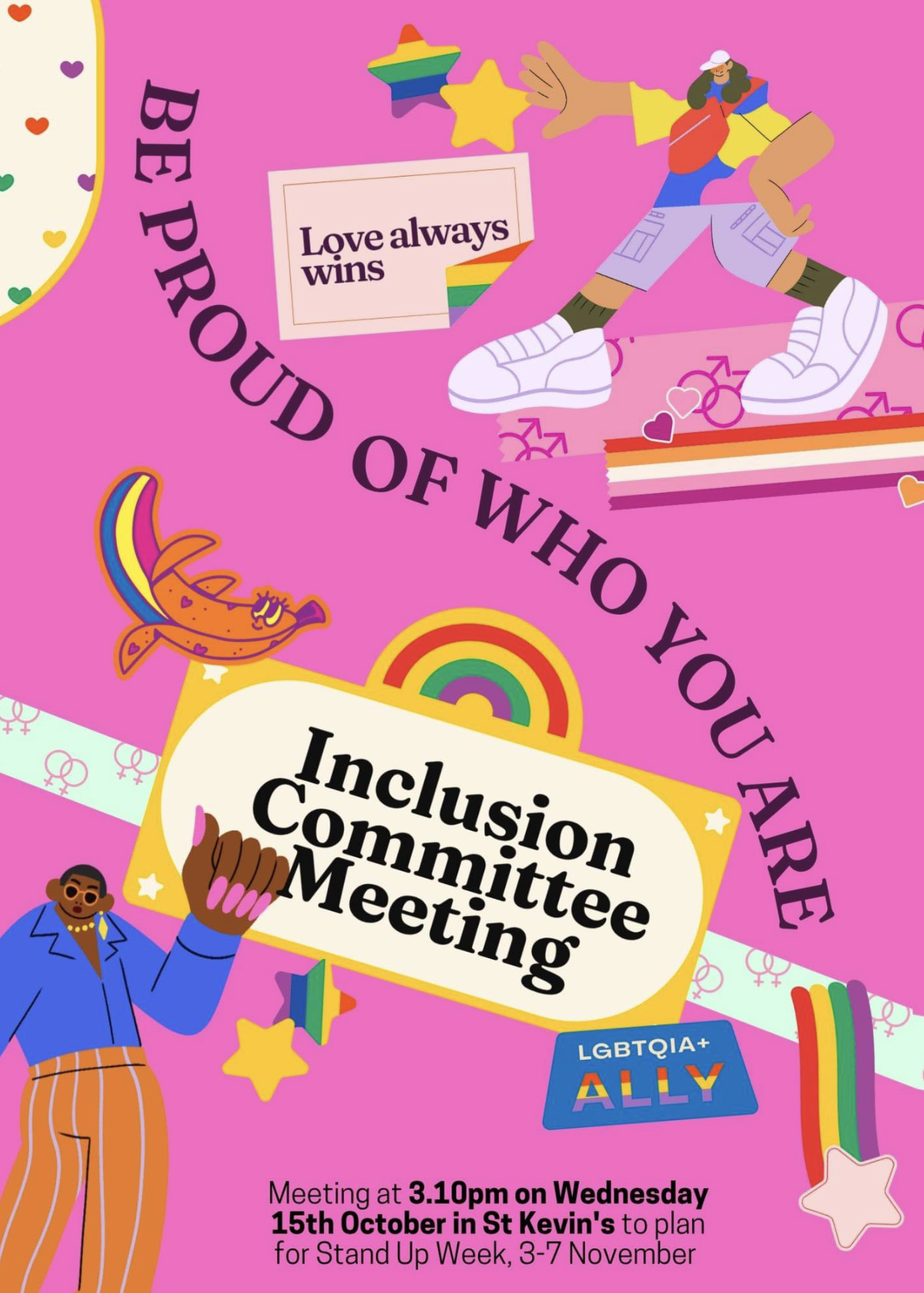 - LGBTQ+ Stand Up Week will be marked in our school from the 3-7th November. We will work with the Wellbeing Committee this year as we plan our celebrations. There are many plans being made which will be finalised at our next meeting. Ideas include a rainbow bake sale, face painting, and pride songs to be played on the intercom. It was also suggested that students could be taught about the history of the LGBTQ movement. The school will be decorated with photos and flags and our inspirational wall will showcase LGBTQ+ role models.