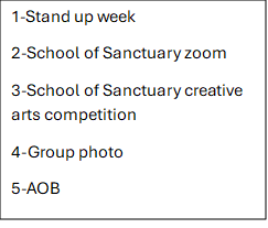 The Inclusion Committee met on Wednesday the 16th of October to discuss Schools of Sanctuary business and make arrangements for Stand-Up Week which will take place here in school and nationally from the 4th of November. Our secretary Haya Al Kasem took the minutes of our meeting: