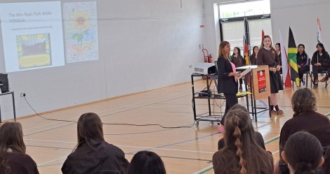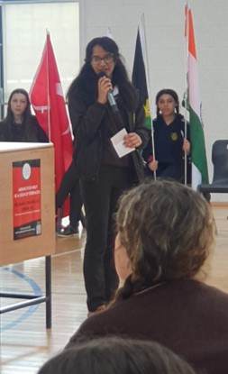 There followed a series of presentations. Malavika Manoj and Sreelakshmy Bino spoke about their videos for ‘Think Languages’ week and Multicultural Week as well as the calendar of the religious festivals of world religions that they created for the John Paul Awards. Yosra El Hussein provided an insightful overview of Hijab Day which she organised as part of Multicultural Week. The Ember Team was represented by Yvette McDonnell, Scarlett Ramsey and Mary Roe. Ms. Johns and Emma Daly spoke eloquently about their work on the Min Ryan Park Walk initiative while Emma also shared information on the lunchtime Board Games Club. Aoife Byrne spoke about the ‘Diverse Voices’ section of our school newsletter and the Multicultural Fashion Show & Stands. Former Head Girl Mindulee Seneviratne sent her best wishes all the way from Australia and encouraged all students, especially those from minority groups, to take on leadership roles as she did. Lilli Mai Harrison recited her poem ‘Beauty in Difference’ accompanied by Úna and the meaningful words really captured the reflective mood of the room. Our flag bearers wrapped up proceedings with a procession from the hall to rapturous applause.