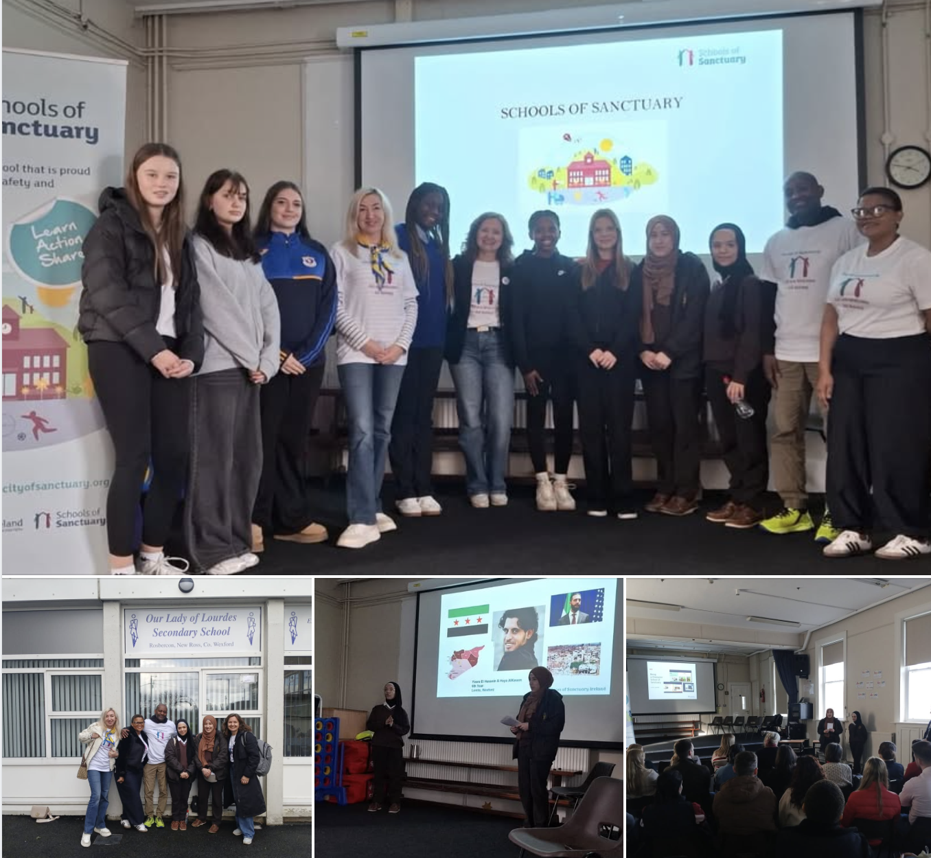 Well done to our School of Sanctuary Ambassadors Yosra El Hussein and Haya Alkasem who travelled to Our Lady of Lourdes, New Ross yesterday to address staff and students. The girls spoke about their experiences in Syria, Lebanon and Ireland and explained how Schools of Sanctuary made a big difference in their lives, helping them to integrate and feel happy and welcome in school. They delivered excellent presentations and inspired students and staff of the school to embark on their own School of Sanctuary journey.