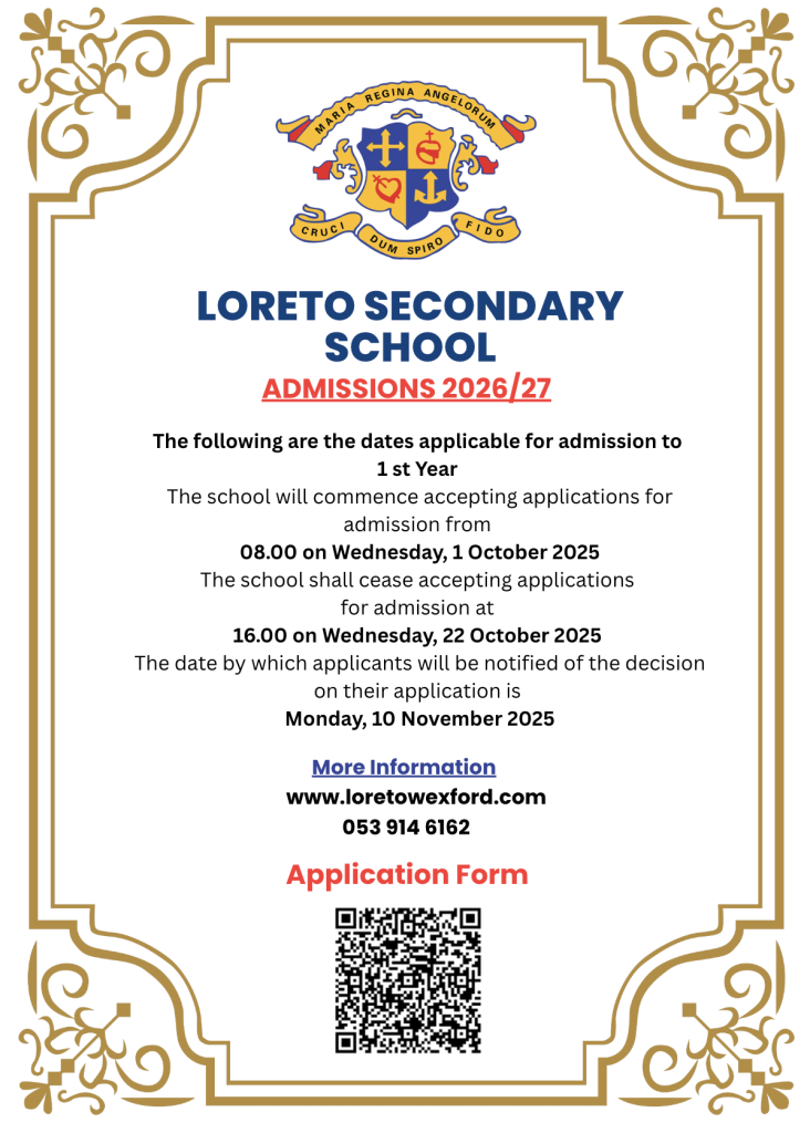 - Tuesday, 7 October – CAO Further Options Info talk- 6th year parents- 17:30, 3rd Year History Trip, Junior Football Match vs Gorey CS @ 11:00 (Away), Loreto Swimming Gala