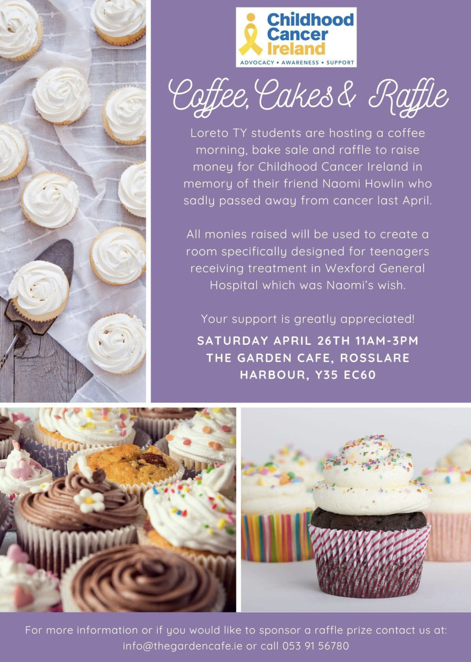 Our Transition Year students are hosting a coffee morning, bake sale & raffle for Childhood Cancer Ireland in memory of Naomi Howlin. Funds will help create a teen treatment room at Wexford General Hospital. Join us at The Garden Cafe, Rosslare Harbour, Sat April 26, 11am-3pm.